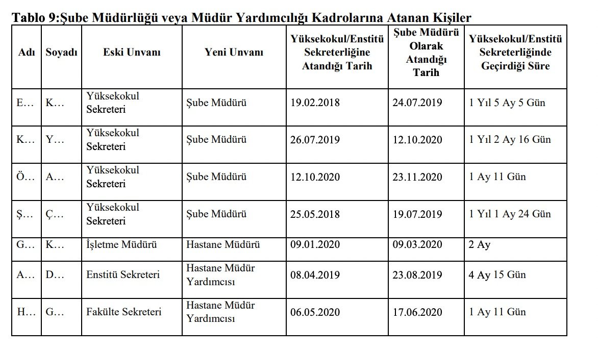 Sayıştay raporunda yer alan bulgulara göre; bu personellerin önce sınav şartı aranmayan Yüksekokul, Enstitü, Fakülte Sekreterliği ile İşletme Müdürlüğü yapıldıkları, bu kadrolarda bir süre bekletildikten sonra da üniversite bünyesinde şube müdürü, hastane müdürü veya müdür yardımcısı kadrolarına atandıkları belirlendi.