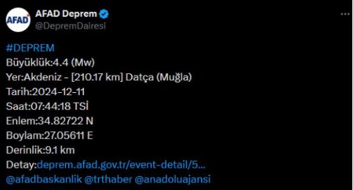 Afet ve Acil Durum Yönetimi Başkanlığı (AFAD), Muğla Datça'da saat 07:44'te 4.4 büyüklüğünde deprem meydana geldiğini duyurdu.