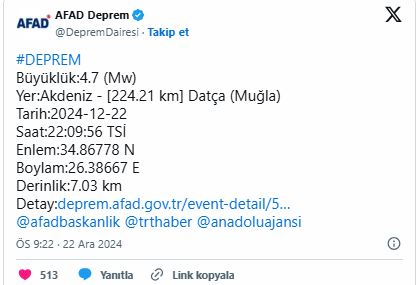 AFAD'ın internet sitesine göre, Akdeniz'de saat 22.09'da 4,7 büyüklüğünde bir deprem meydana geldi. Muğla'nın Datça ilçesinin 224 kilometre açığındaki sarsıntı, 7,03 kilometre derinlikte gerçekleşti.
