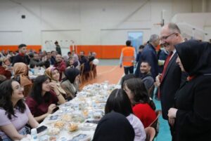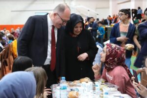 Okulun spor salonunda düzen programda yaklaşık 1000 öğrenci ve aileleri ile birlikte iftar sofrasında bir araya gelen Bilgin, masaları tek tek dolaşarak katılımlarının Ramazan ayını tebrik etti.