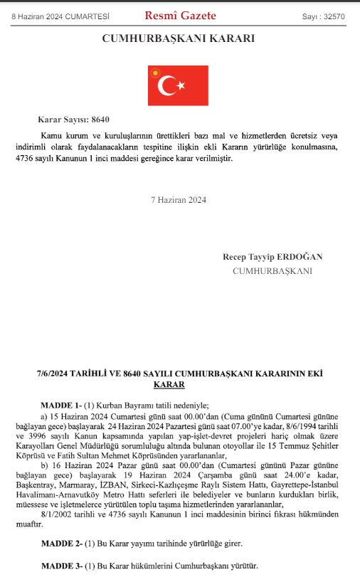 Kurban Bayramı tatilinde yap-işlet-devret projeleri hariç köprü ve otoyollar ile Ankara, İstanbul ve İzmir'de metre ve raylı sistemlerin ücretsiz olmasına ilişkin Cumhurbaşkanı Kararı Resmi Gazete'de yayımlandı.
