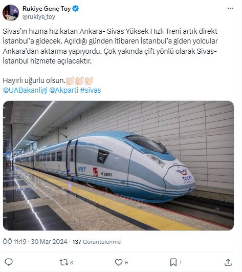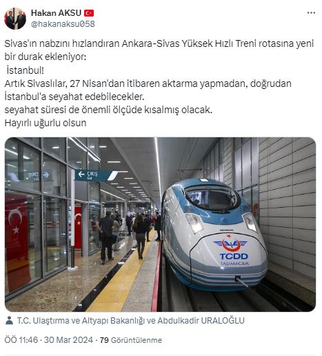 "Sivas’ın hızına hız katan Ankara- Sivas Yüksek Hızlı Treni artık direkt İstanbul’a gidecek. Açıldığı günden itibaren İstanbul’a giden yolcular Ankara’dan aktarma yapıyordu. Çok yakında çift yönlü olarak Sivas-İstanbul hizmete açılacaktır.
