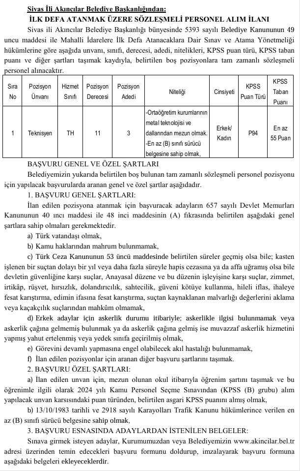 Sivas’ın Akıncılar ilçesinde Belediye Başkanlığı, 5393 sayılı Belediye Kanunu’nun 49. maddesi kapsamında sözleşmeli teknisyen alımı yapacağını duyurdu.