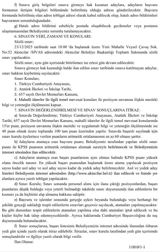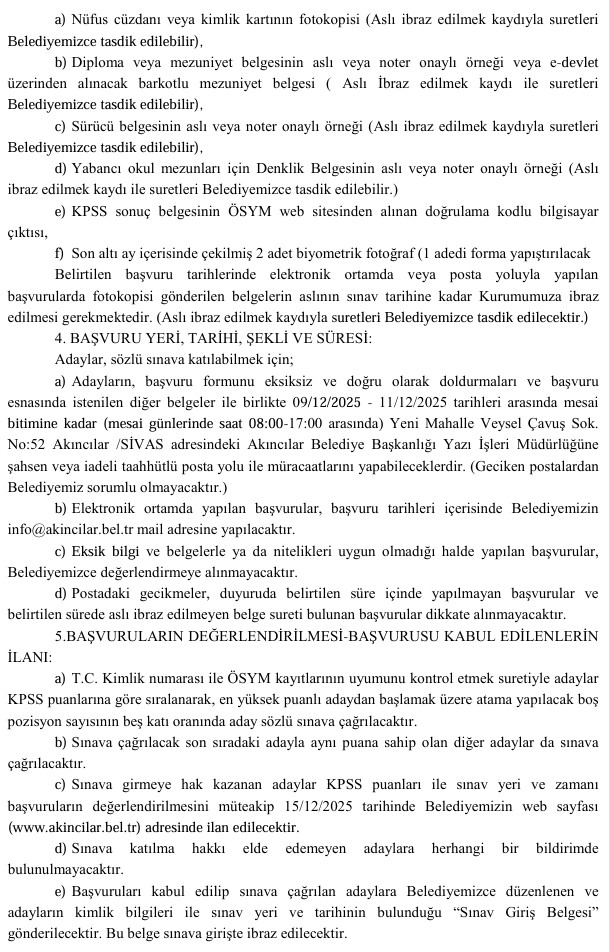 Sözlü sınav, 23 Aralık 2025 Salı günü saat 10.00’da Akıncılar Belediye Başkanlığı Toplantı Salonu’nda yapılacak.
