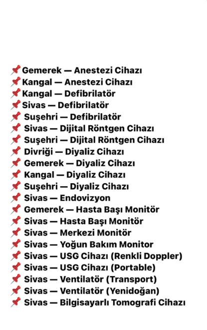 Ayrıca Toy, paylaşımında Sivas'a verilen sağlık cihazlarının listesini de paylaştı.