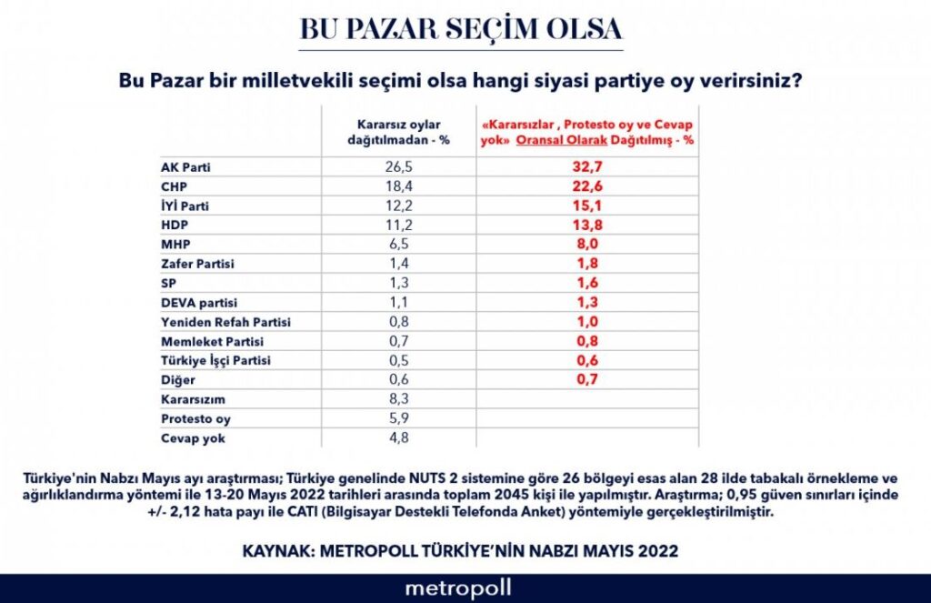 AK Parti'nin yüzde 32,7 çıktığı araştırmada, ikinci sırayı CHP 22,6 ile aldı.