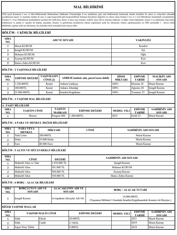 Kurum'un açıkladığı mal beyanında 1 araç, Ankara'da iki konut, İstanbul'da bir konut, bir miktar altın ve takı ile 3 silah yer aldı.