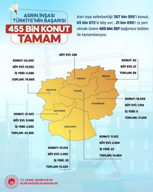 Hatay’da toplam 153 bin 755, Kahramanmaraş’ta 73 bin 956, Malatya’da 79 bin 660, Adıyaman’da 43 bin 366 bağımsız bölüm tamamlanırken; Gaziantep, Adana, Şanlıurfa, Diyarbakır, Elazığ, Tunceli ve Bingöl’de de çalışmalar büyük ölçüde sonuçlandı.