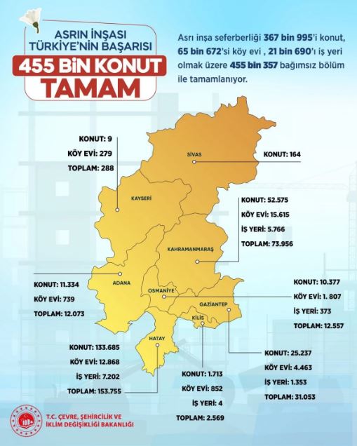 “Asrın İnşası Türkiye’nin Başarısı” başlığıyla paylaşılan verilere göre; proje kapsamında 367 bin 995 konut, 65 bin 672 köy evi ve 21 bin 690 iş yeri olmak üzere toplam 455 bin 357 bağımsız bölüm tamamlandı. Bakan Kurum, bu sürecin devlet-millet dayanışmasının en güçlü örneklerinden biri olduğunu vurguladı.