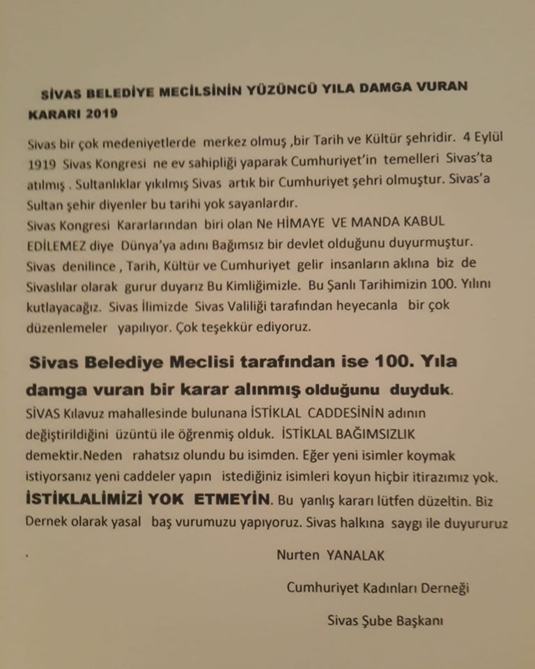 Konuyla ilgili açıklama Cumhuriyet Kadınları Derneği Sivas Şube Başkanı Nurten YANALAK ve yönetiminden geldi. Yanalak " Istiklâl adı değiştirilemez. Değişmemesi için bütün hukuki yollara başvururuz" diyerek dava açacaklarını duyurdu.
