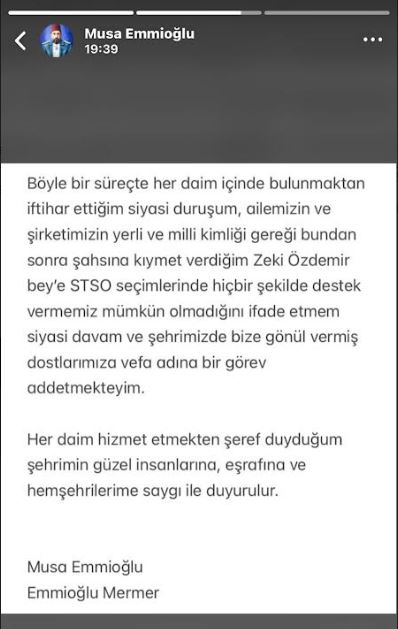Sivas Ticaret ve Sanayi Odası başkan adayı Zeki Özdemir'in yer aldığı 2.meslek komitesinden Meclis adayı olan iş insanı Musa Emmioğlu çekildiğini açıkladı