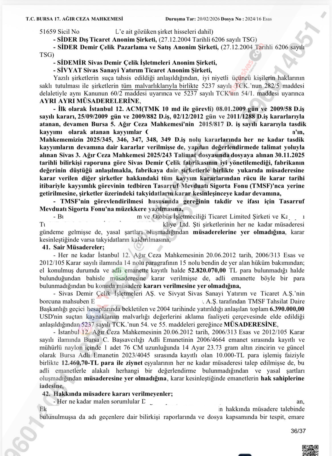 Kararda; Sider Dış Ticaret A.Ş., Sider Demir Çelik Pazarlama ve Satış A.Ş., Sidemir Sivas Demir Çelik İşletmeleri A.Ş. ve Sivyat Sivas Sanayi Yatırım Ticaret A.Ş.’nin mal varlıklarının, Türk Ceza Kanunu kapsamında müsaderesine karar verildiği belirtildi.