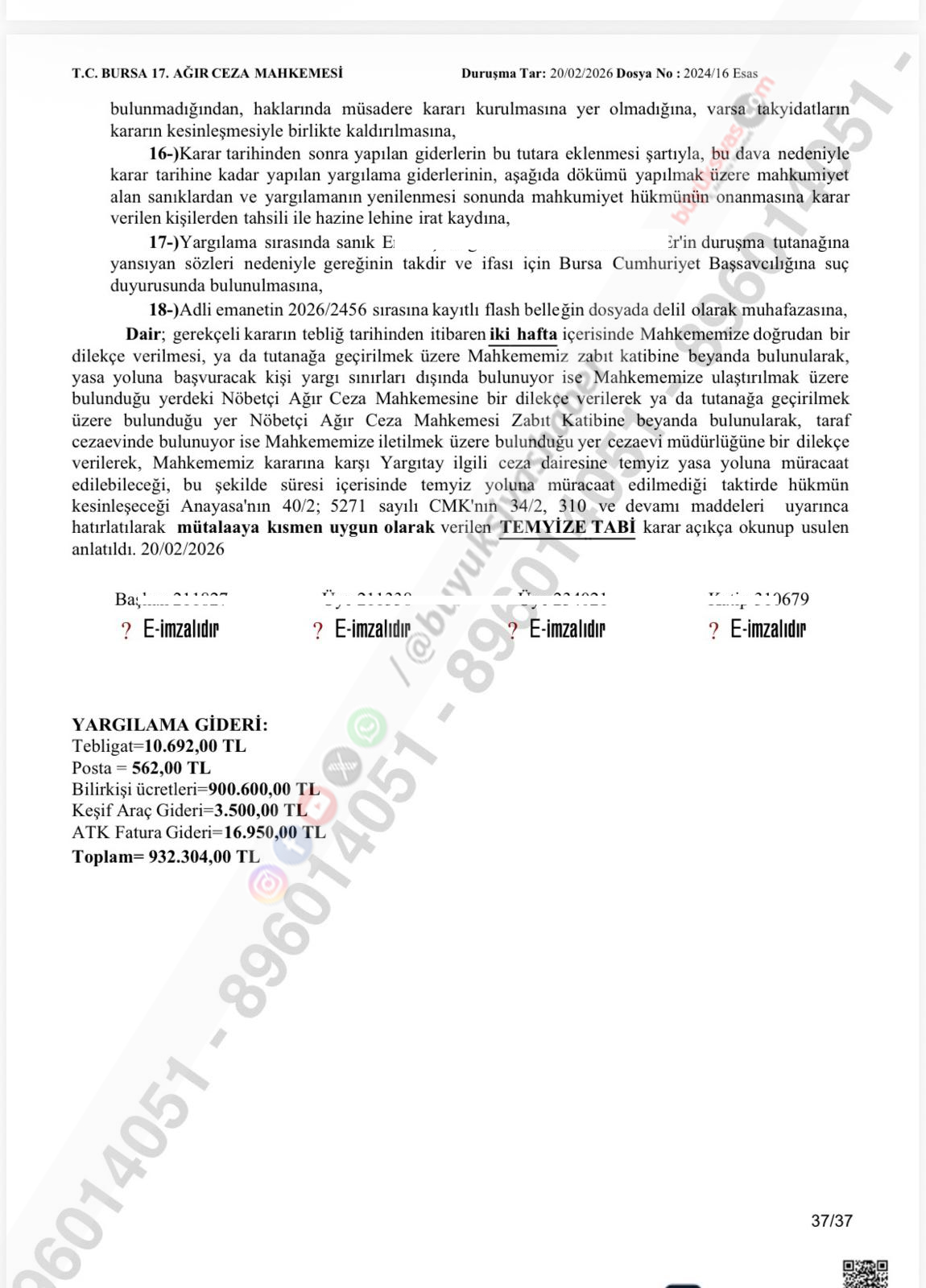 Mahkeme kararının temyize açık olduğu ve Yargıtay sürecinin devam ettiği öğrenildi.