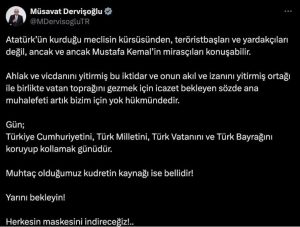 Dervişoğlu, Türkiye Cumhuriyeti, Türk milleti ve bayrağını korumanın önemine vurgu yaparak, "Muhtaç olduğumuz kudretin kaynağı bellidir. Yarını bekleyin, herkesin maskesini indireceğiz!" dedi.