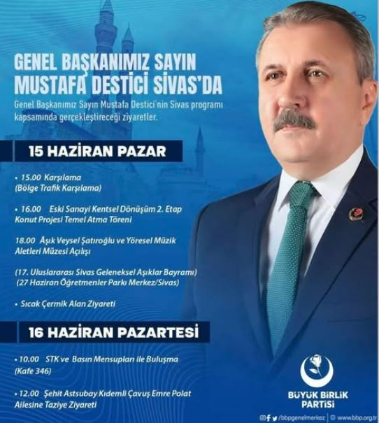 Büyük Birlik Partisi (BBP) Genel Başkanı Mustafa Destici, 15-16 Haziran tarihlerinde Sivas’a bir dizi program ve ziyaret kapsamında geliyor.