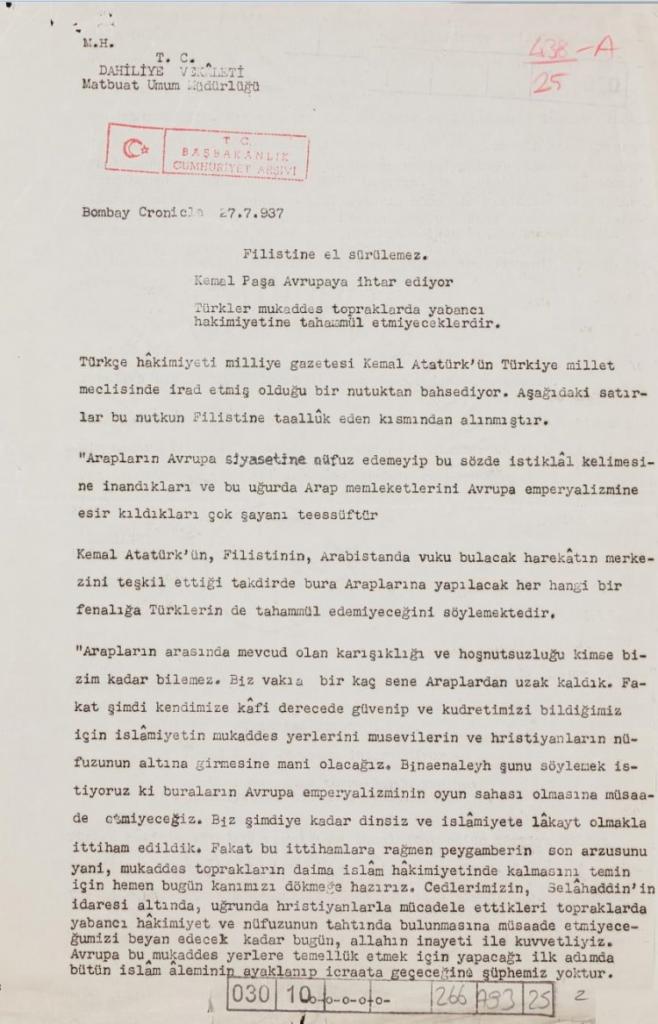 Atatürk’ün Avrupa’ya Filistin konusunda ültimatom verdiğini gösterir açıklamaları şöyle: Biz vakıa bir kaç sene Araplardan uzak kaldık. Fakat şimdi kendimize kâfi derecede güvenip ve kudretimizi bildiğimiz için İslamiyet’in mukaddes yerlerini Musevilerin ve Hristiyanların nüfuzunun altına girmesine mani olacağız. Biz şimdiye kadar dinsiz ve İslamiyet’e lakayt olmakla itham edildik.