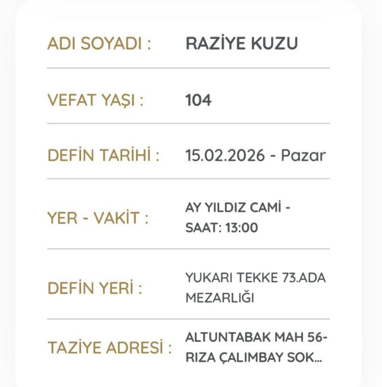 Rahmetli Raziye Kuzu’nun cenaze namazının saat 13.00’te Yukarı Tekke Ayyıldız Camisi’nde kılınacağı ve ardından defnedileceği öğrenildi. Cenaze törenine katılmak üzere eski TBMM Başkanı Mustafa Şentop da Sivas’a geldi.