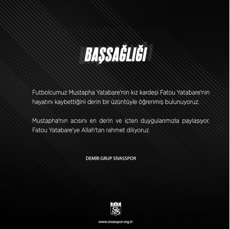 DG Sivasspor'un deneyimli forvet oyuncusu Mustapha Yatabare’nin kız kardeşi vefat etti.