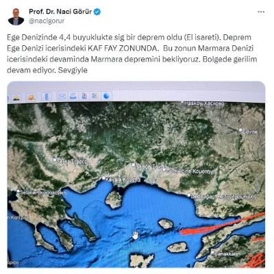 "Ege Denizinde 4,4 büyüklükte sığ bir deprem oldu (El işareti). Deprem Ege Denizi içerisindeki KAF FAY ZONUNDA. Bu zonun Marmara Denizi içerisindeki devamında Marmara depremini bekliyoruz. Bölgede gerilim devam ediyor. Sevgiyle"