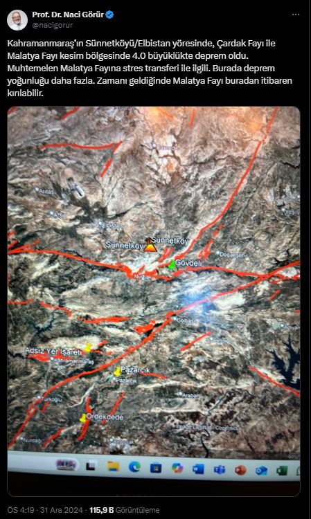 Afet ve Acil Durum Yönetimi Başkanlığı (AFAD), Kahramanmaraş’ın Elbistan ilçesinde dün 4 büyüklüğünde bir deprem olduğunu duyurdu. Deprem, bölgede yaşayan vatandaşlar kısa süreli paniğe sebep oldu. Yer bilimci Prof. Dr. Naci Görür, Kahramanmaraş'taki depremle ilgili sosyal medya hesabından önemli açıklamalarda bulundu. Görür, depremin yaşandığı bölgeyi ve olası etkilerini değerlendirdi.