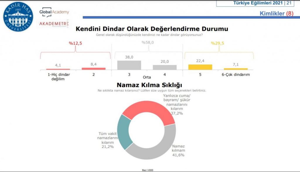 Araştırmada dikkat çeken bir başka sonuç ise insanların kendini dindar olarak görme oranları ve bu şekilde tanımlayanların namaz kılma sıklıkları.