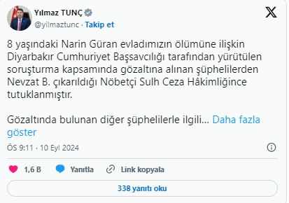 Nevzat B.'nin tutuklanma haberini resmi X hesabından duyuran Adalet Bakanı Yılmaz Tunç, gözaltında bulunan diğer şüphelilerin ilgili işlemlerinin devam ettiğini bildirdi. Bakan Tunç açıklamasında, "8 yaşındaki Narin Güran evladımızın ölümüne ilişkin Diyarbakır Cumhuriyet Başsavcılığı tarafından yürütülen soruşturma kapsamında gözaltına alınan şüphelilerden Nevzat B. çıkarıldığı Nöbetçi Sulh Ceza Hâkimliğince tutuklanmıştır.
