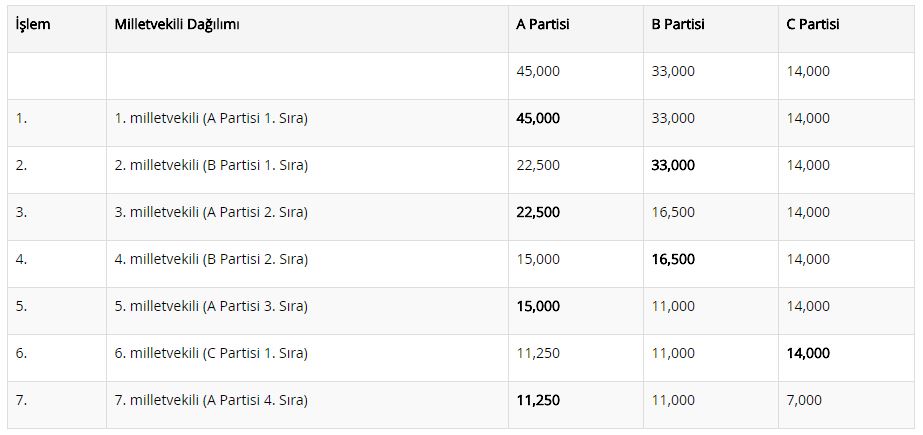 İşlem 3: En çok oy (22,500) A Partisi’nde olduğu için A Partisi 2. sıra milletvekili adayı milletvekili seçilmiş olur ve A Partisi’nin oyu bu sefer 3’e bölünür (45,000/3 = 15,000).