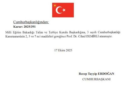 2025/391 sayılı Cumhurbaşkanı Kararı ile Milli Eğitim Bakanlığı Talim ve Terbiye Kurulu Başkanlığına Prof. Dr. Cihad Demirli atandı.