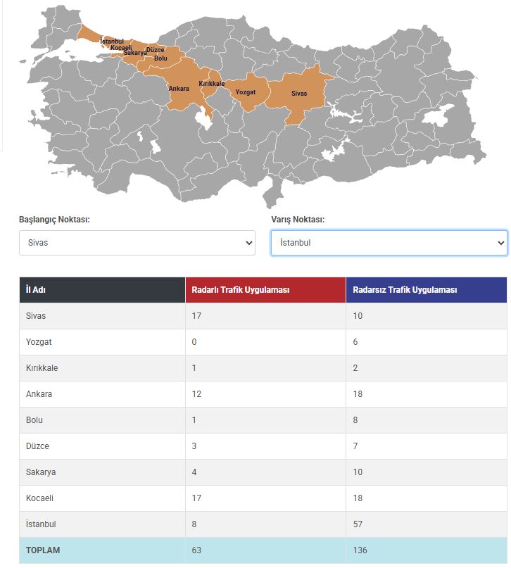 Sivas’tan İstanbul’a dönüş güzergahını kullanan vatandaşlar, toplam 63 radarlı ve 136 radarsız trafik denetimiyle karşılaşacak. Bu veriler, radar uygulamalarına karşı dikkatli olunması gerektiğini bir kez daha gözler önüne seriyor.