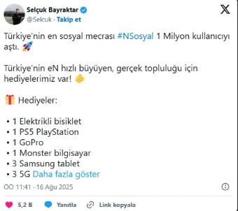 Next Sosyal 1 milyon kullanıcıyı geçti! Selçuk Bayraktar büyük ödülleri duyurdu!