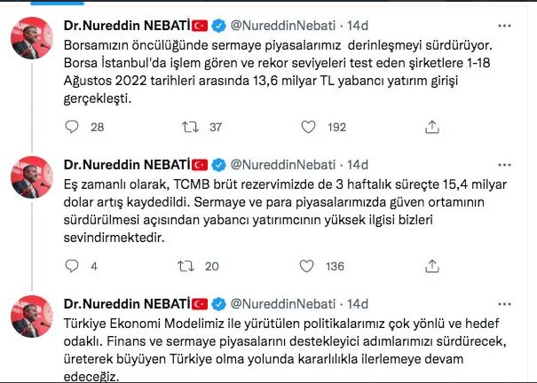 Hazine ve Maliye Bakanı Nebati, Borsa İstanbul'da işlem gören şirketlere 1-18 Ağustos 2022 tarihleri arasında 13,6 milyar TL yabancı yatırım girişi gerçekleştiğini duyurdu.