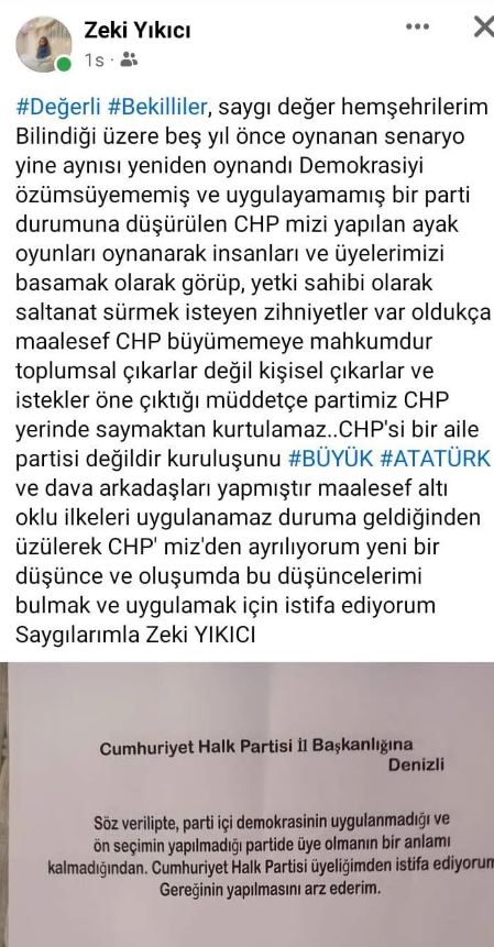 Tepkisinde olduğu gibi yaptığı resmi istifa başvurusunu da sosyal medya hesabından duyuran CHP eski İlçe Başkanı Zeki Yıkıcı, dilekçeyle başvuru yaparak partisinden istifa etti.