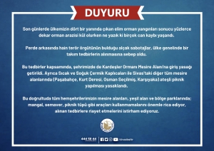 Bu Doğrultuda tüm hemşehrilerimizin mesire alanları yeşil alan ve bölge parklarında; mangal,semaver,piknik tüpü gibi araçları kullanmamalarını önemle rica ediyor, alınan tedbirlere rivayet etmelerini istirham ediyoruz."