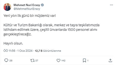 Kültür ve Turizm Bakanı Mehmet Nuri Ersoy sosyal medya hesabından açıklama yaptı.