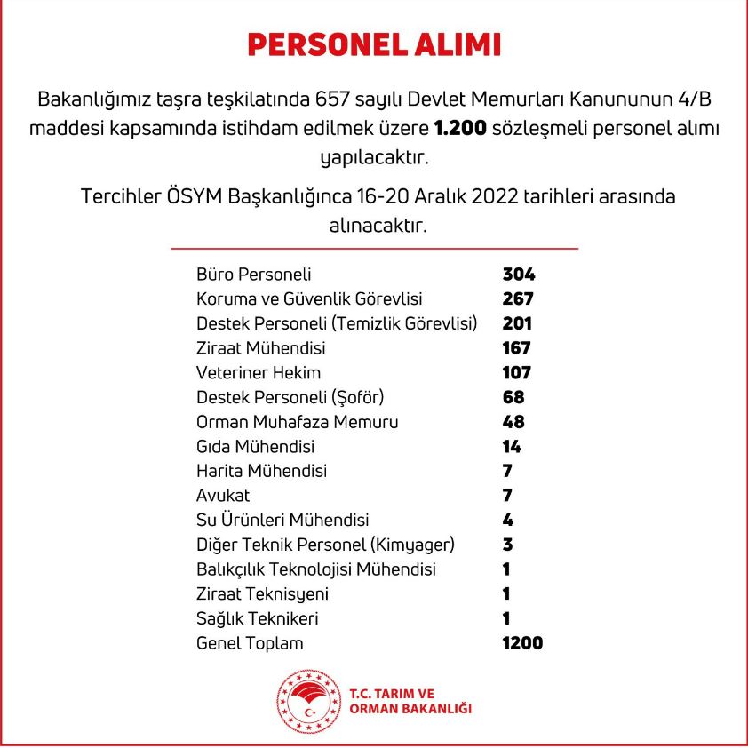 T.C. Tarım ve Orman Bakanlığı'ndan yapılan açıklamada: "taşra teşkilatında 657 sayılı Devlet Memurları Kanununun 4/B maddesi kapsamında istihdam edilmek üzere 1.200 sözleşmeli personel alımı yapılacaktır. Hayırlı, uğurlu olsun.