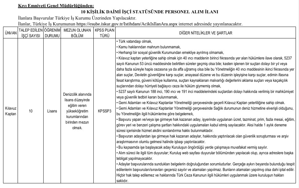 Kıyı Emniyeti, personel alımı, İŞKUR, kılavuz kaptan, kamu ilanı