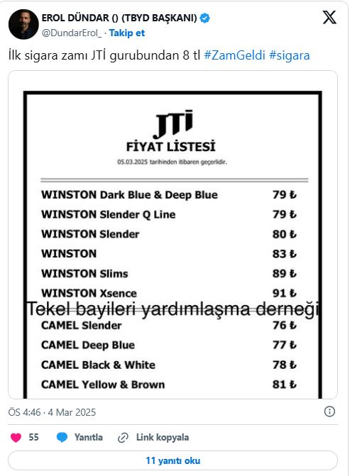 Dündar paylaşımında, "İlk sigara zammı JTİ grubundan geldi. 8 TL zam yapıldı." ifadelerini kullandı. Yeni fiyatların güncellenerek bayilere bildirildiği öğrenildi.