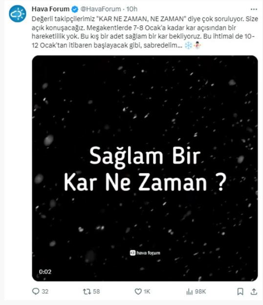 "Megakentlerde 7-8 Ocak'a kadar kar açısından bir hareketlilik yok. Bu kış bir adet sağlam bir kar bekliyoruz. Bu ihtimal de 10-12 Ocak'tan itibaren başlayacak gibi, sabredelim..."