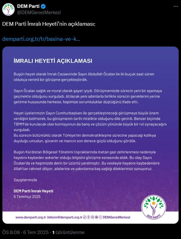 DEM Parti İmralı Heyeti, 6 Temmuz 2025 tarihinde İmralı Cezaevi’nde Abdullah Öcalan ile iki buçuk saat süren bir görüşme gerçekleştirdi. Heyet, görüşmenin "oldukça verimli" geçtiğini belirtti.