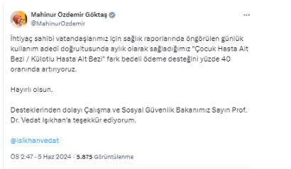 "İhtiyaç sahibi vatandaşlarımız için sağlık raporlarında belirtilen günlük kullanım miktarına göre aylık olarak sağlanan çocuk hasta alt bezi ve külotlu hasta alt bezi fark bedeli ödeme desteğini %40 oranında artırıyoruz. Hayırlı olsun."