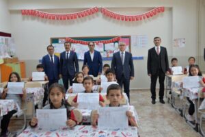 Karne dağıtım programına katılan İl Milli Eğitim Müdürü Ergüven Aslan’da 3 sınıf öğrencilerine karne verdi. Velilerle ve öğrencilerle sohbet eden Aslan, çocukların ve velilerin karne heyecanına ortak oldu.