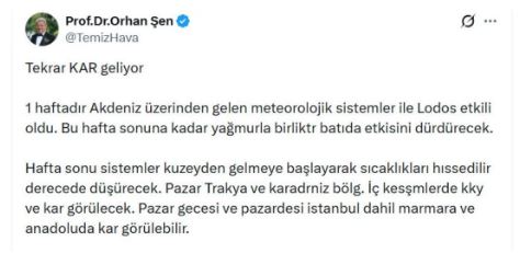 “Tekrar kar geliyor. Bir haftadır Akdeniz üzerinden gelen meteorolojik sistemlerle lodos etkili oldu. Bu hafta sonuna kadar batıda yağmurla birlikte etkisini sürdürecek. Hafta sonu sistemler kuzeyden gelmeye başlayarak sıcaklıkları hissedilir derecede düşürecek. Pazar Trakya ve Karadeniz Bölgesi iç kesimlerinde karla karışık yağmur ve kar görülecek. Pazar gecesi ve pazartesi İstanbul dahil Marmara ve Anadolu’da kar görülebilir.”