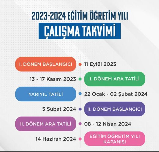 Takvime göre 2023-2024 eğitim-öğretim yılı 11 Eylül 2023 tarihinde başlayacak ve 14 Haziran 2024 tarihinde sona erecek.