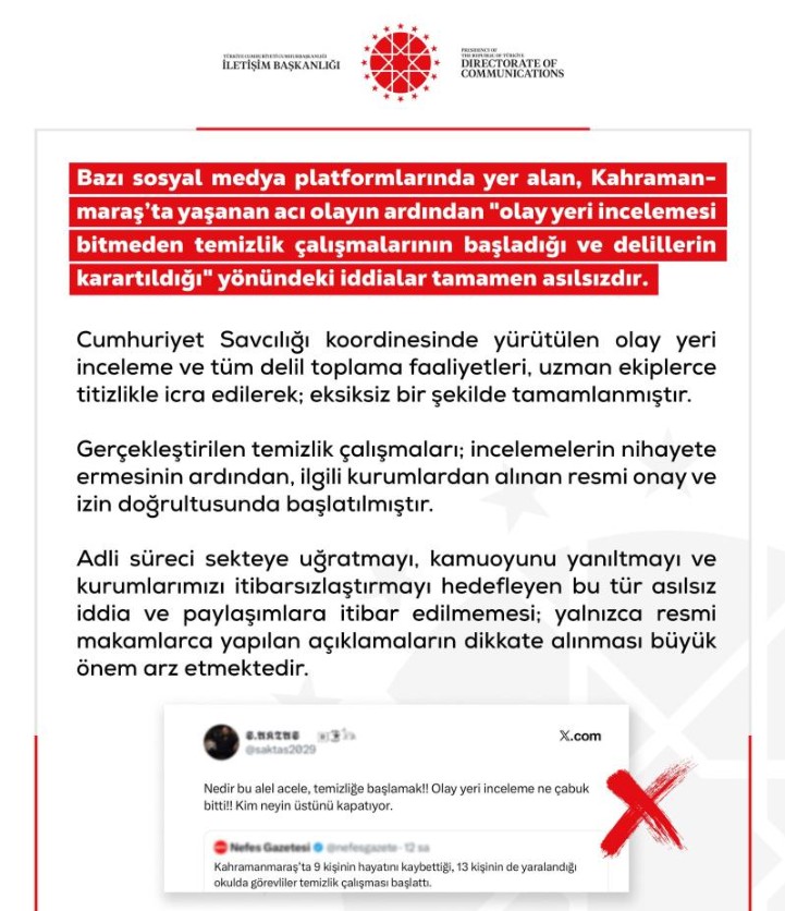 Merkezin resmi sosyal medya hesabından yapılan açıklamada, bazı platformlarda yer alan “olay yeri incelemesi tamamlanmadan temizlik yapıldığı ve delillerin karartıldığı” yönündeki iddiaların gerçeği yansıtmadığı bildirildi.