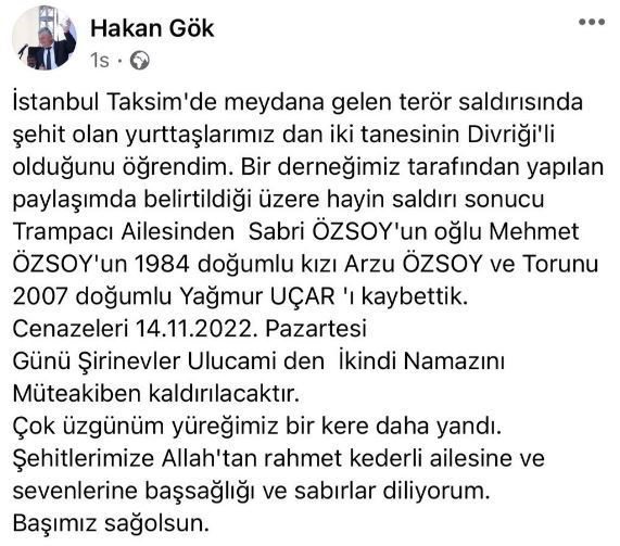 Sosyal medya hesabından başkan Gök "İstanbul Taksim'de meydana gelen terör saldırısında şehit olan yurttaşlarımız dan iki tanesinin Divriği'li olduğunu öğrendim. Bir derneğimiz tarafından yapılan paylaşımda hayin saldırı sonucu Trampacı Ailesinden Sabri ÖZSOY'un oğlu Mehmet ÖZSOY'un 1984 doğumlu kızı Arzu ÖZSOY ve Torunu 2007 doğumlu Yağmur UÇAR 'ı kaybettik