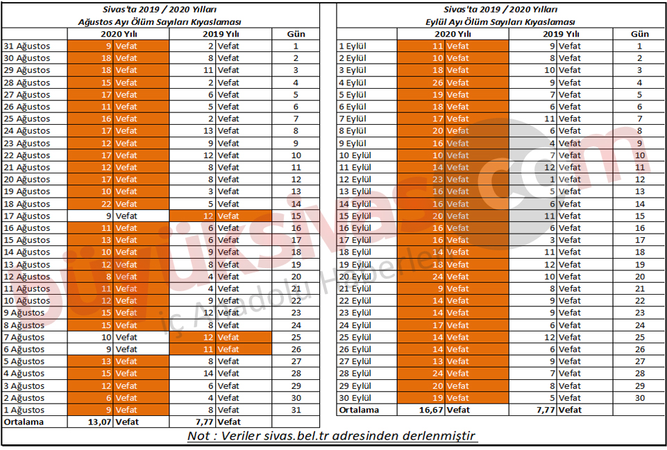 Sivas'ta geçtiğimiz yıla oranla Ağustos ayında artan ölümler Eylül ayında da artmaya devam etti. Ayrıca 2020 yılı içerisinde birbirini takip eden Ağustos ve Eylül aylarında da ölenlerin sayısı arttı.
