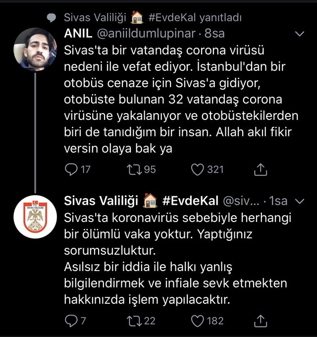 Geçtiğimiz günlerde sosyal medyada Anıl isminde bir kullanıcının "Sivas'ta bir vatandaş corona virüsü nedeni ile vefat ediyor. İstanbul'dan bir otobüs cenaze için Sivas'a gidiyor, otobüste bulunan 32 vatandaş corona virüsüne yakalanıyor ve otobüstekilerden biri de tanıdığım bir insan. Allah akıl fikir versin olaya bak ya" paylaşımı sonrası Sivas Valiliği tweti alıntılayarak cevap veriyor ve Sivas'ta koronavirüs sebebiyle herhangi bir ölümlü vaka yoktur" diyor