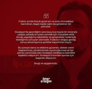Futbolun doğası gereği, istenilen sonuçlar alınamayınca ayrılıkların kaçınılmaz olduğunu vurgulayan Erdoğan, kendisine ve ekibine güvenen, destek veren başkan, yönetim, oyuncular ve taraftarlara içtenlikle teşekkür etti. Sivasspor’a bundan sonraki süreçte başarılar dilediğini ifade eden genç teknik adam, mesajını "Sevgi ve saygılarımla…" sözleriyle noktaladı.
