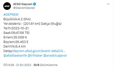 Afet ve Acil Durum Yönetimi Başkanlığının (AFAD) internet sitesinde yer alan bilgiye göre, Akdeniz'de Muğla'nın Datça ilçesine 201,61 kilometre mesafede 4,2 büyüklüğünde sarsıntı kaydedildi.