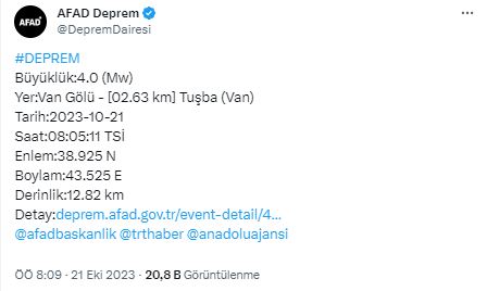 AFAD'dan aktarılan habere göre; Van'ın Tuşba ilçesinde saat 08:05'te 4 büyüklüğünde deprem gerçekleşti.